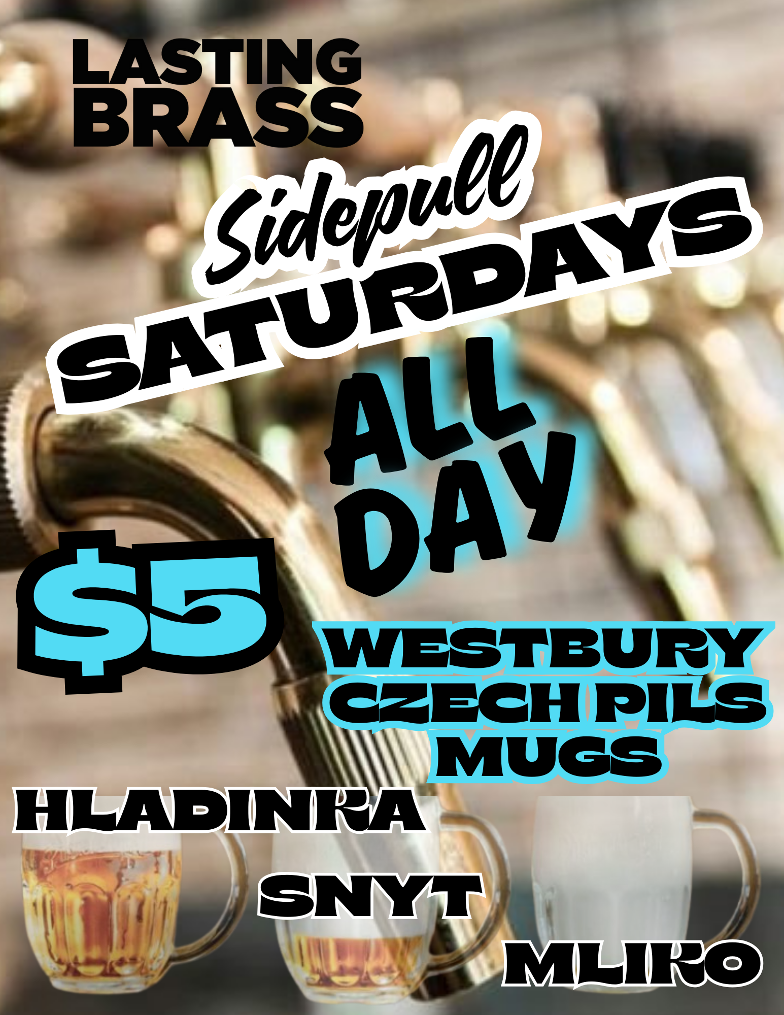 Sidepull Saturdays!!! Come in for $5.00 Westbury Czech Pils 16oz Mugs all day!!! + Add to Google Calendar + iCal / Outlook export 00 days 00 hours 00 minutes 00 seconds Date Oct 11 2025 Time 2:00 pm - 8:00 pm Location Lasting Brass Brewery Oakville, CT Category Special Event Share this event
